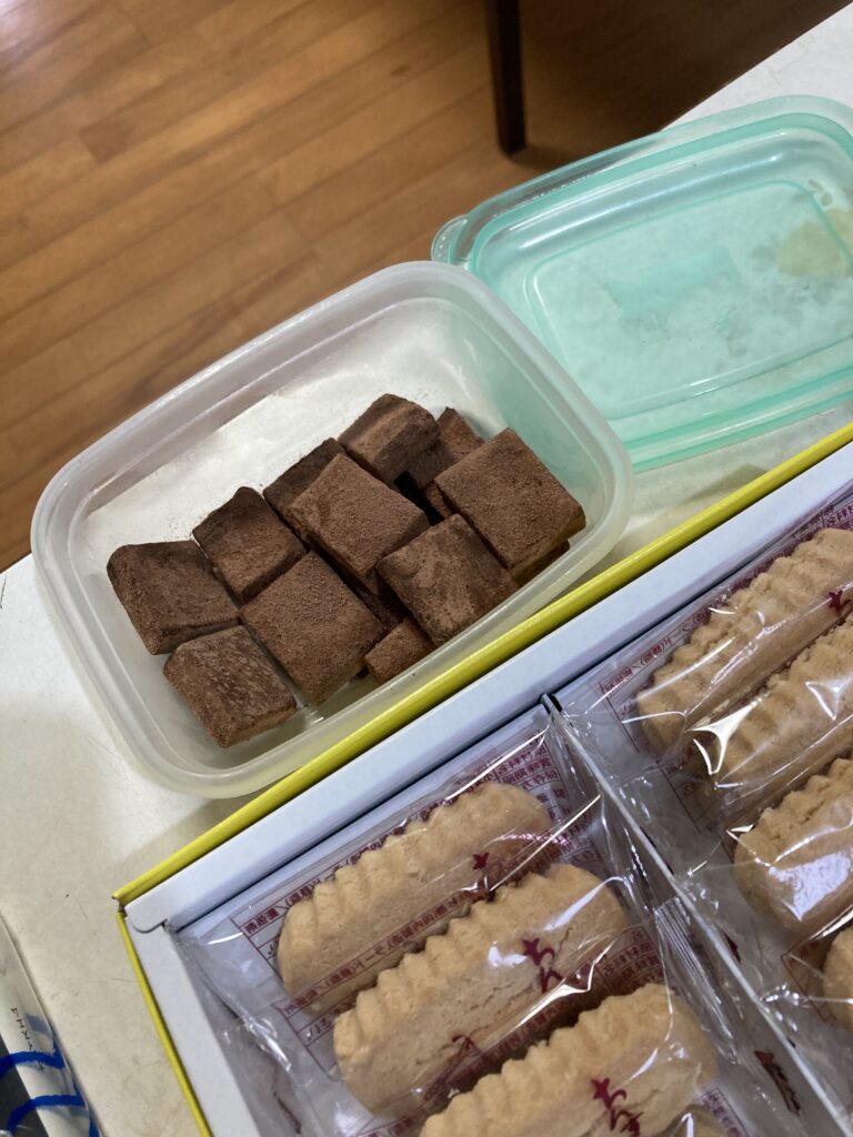 今日のおやつは、職員の辻が作ってくれた生チョコとちんすこうでした。