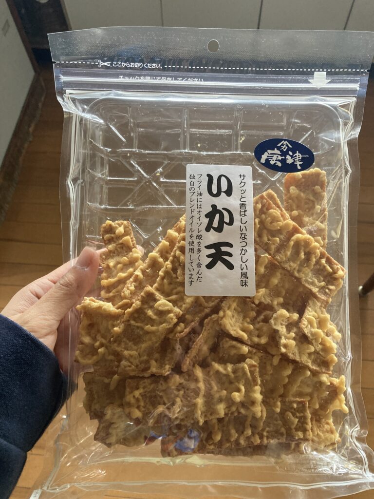 今日のおやつはいろいろいただきました。Nさんからの差し入れのおいしいイカ天だけ写真に撮ってました。
