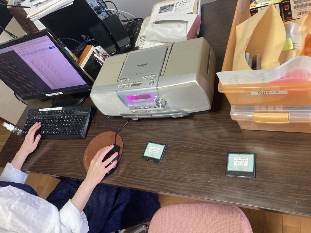 Nさんは前回に引き続き、MDのデジタル化と音声内容確認作業を進めてもらいました。デッキのボタンを連打する音と、録音されているインタビューや講演会の音声が事務棟に響きます。