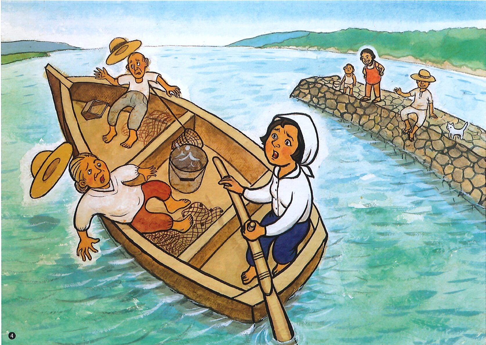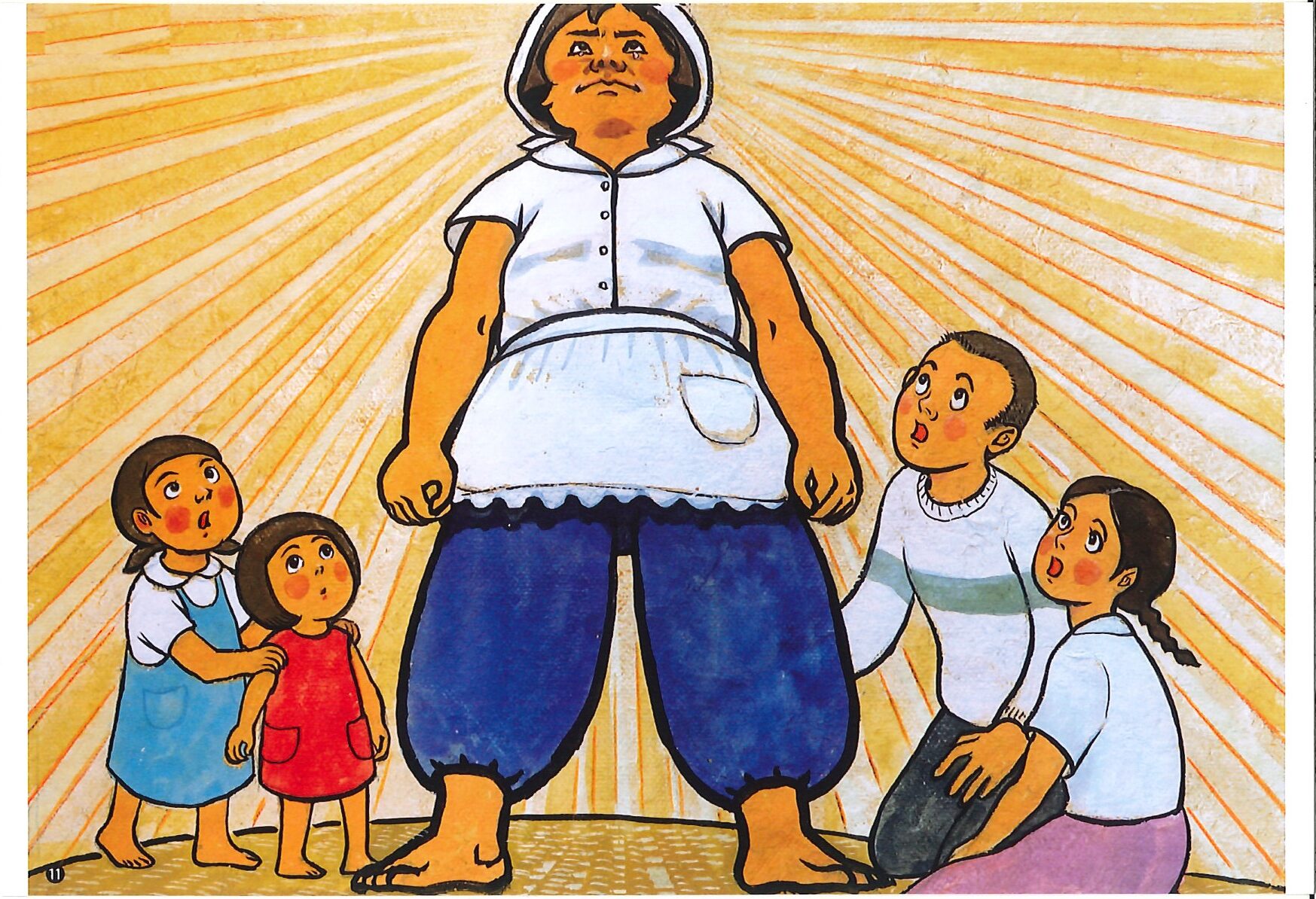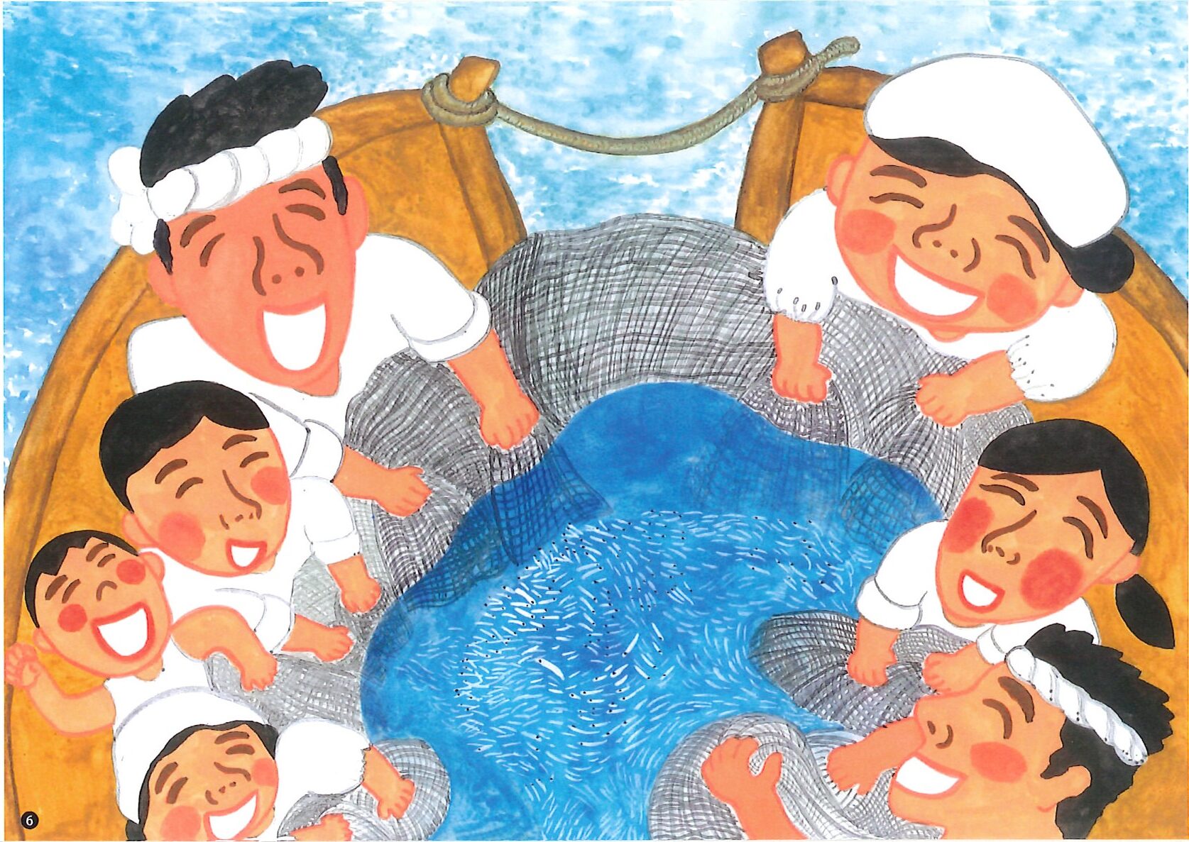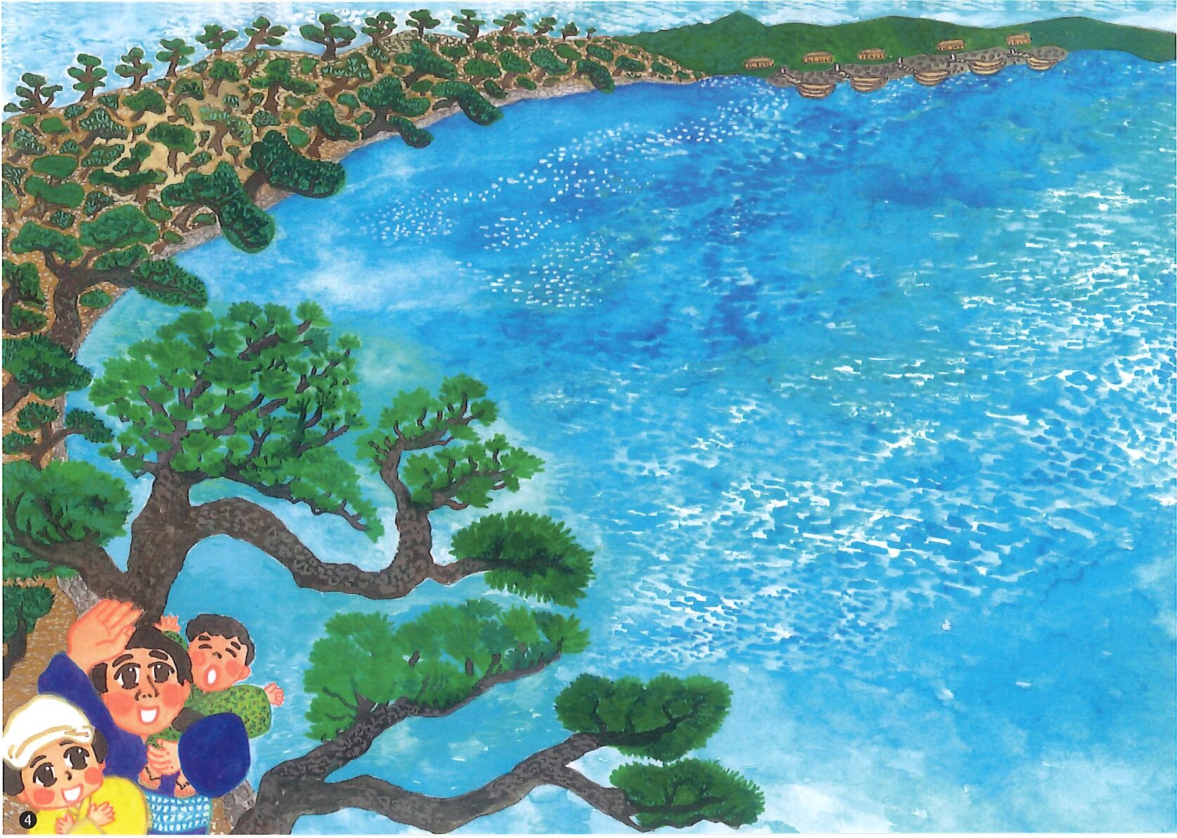 絵はがき5枚セット。水俣出身の画家の鶴岡元子さん、紙芝居「しらぬいさん」、紙芝居「みつこの詩」場面よりの絵をそれぞれ封入。